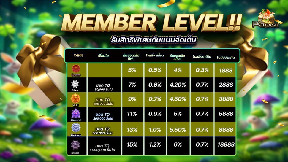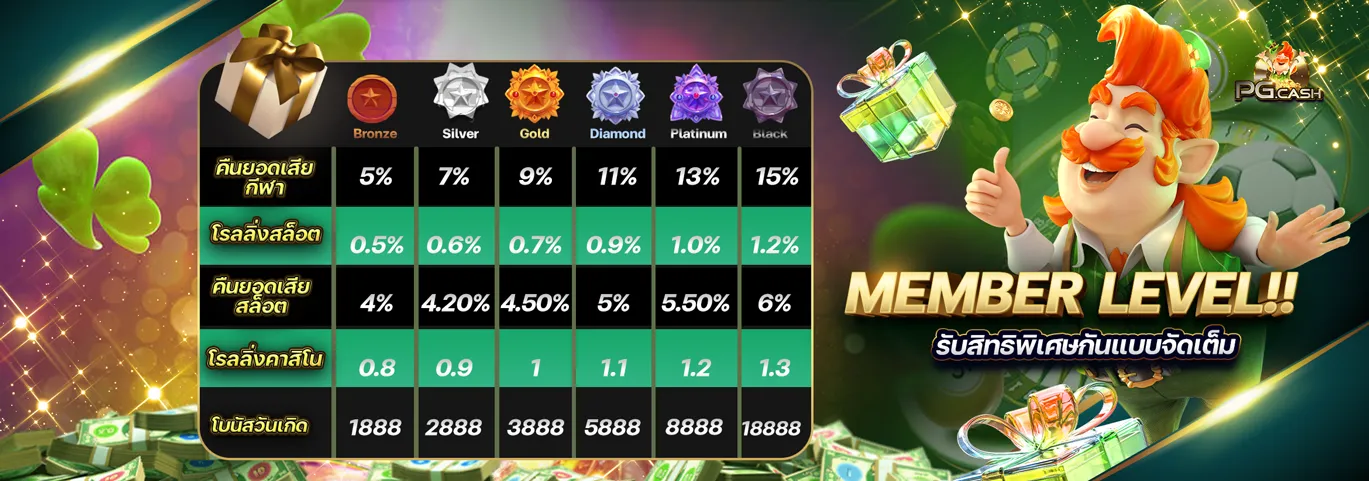 ที่ PG.CASH เราใส่ใจในทุกรายละเอียดเพื่อให้สมาชิกได้รับประสบการณ์ที่ดีที่สุด นอกจากโบนัสต้อนรับแล้ว เรายังมีโปรโมชั่นพิเศษอื่นๆ อีกมากมายที่หมุนเวียนมาให้คุณได้ร่วมสนุกตลอดทั้งเดือน ไม่ว่าจะเป็นเครดิตคืนรายสัปดาห์ โบนัสวันเกิด หรือกิจกรรมพิเศษในช่วงเทศกาลต่างๆ